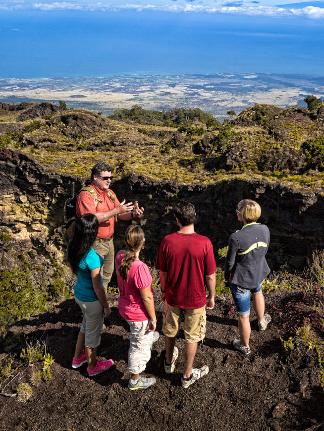 Venture through ancient native Hawaiian cloud forests, navigate a wild lava tube and stand in awe at the edge of massive fissures and craters formed by Kona’s most recent eruption. Capture stunning panoramic views over 5,000 feet above the Kona coastline.